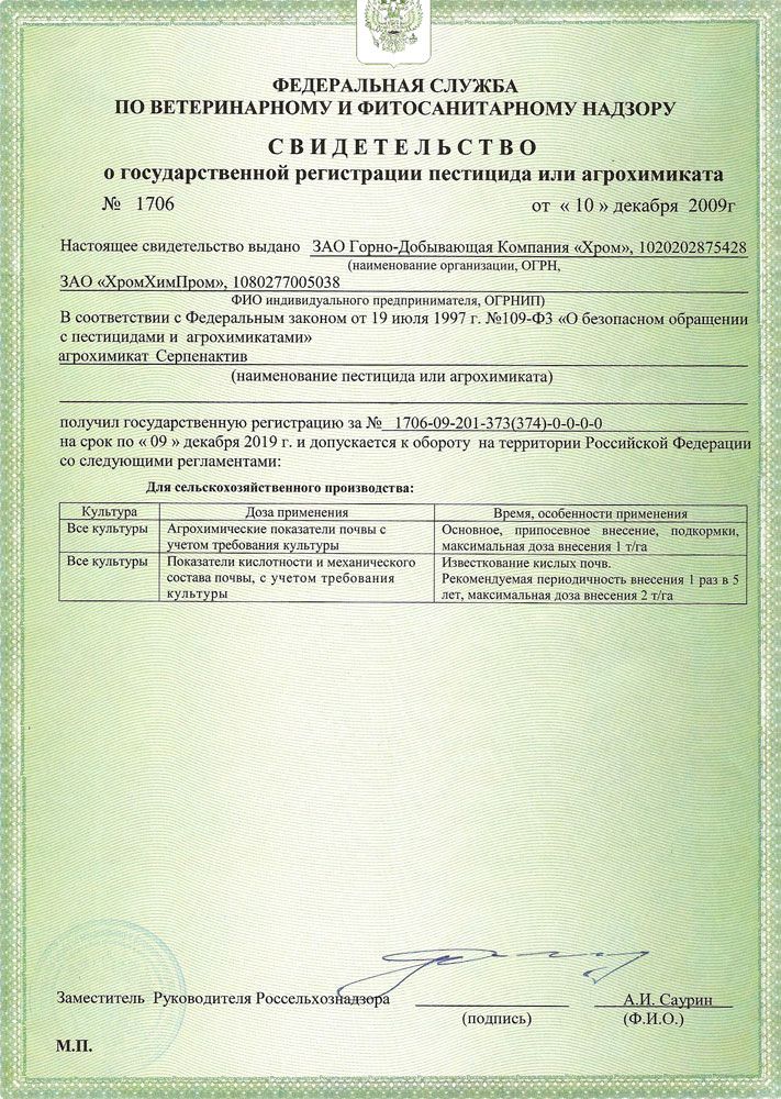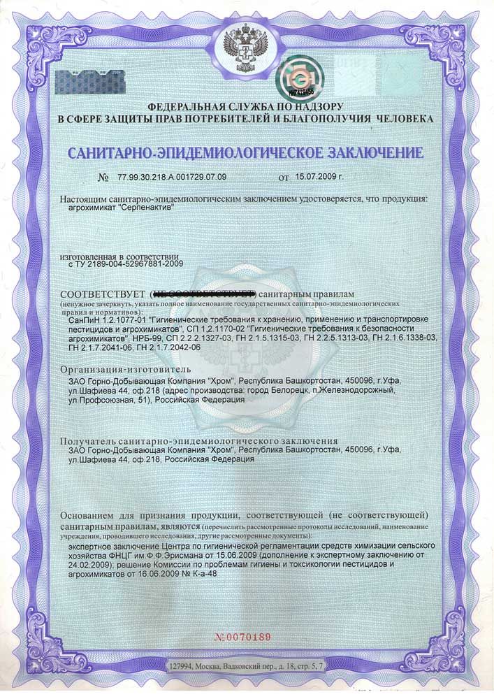 Государственная регистрация и сертификация агрохимиката «Серпенактив»