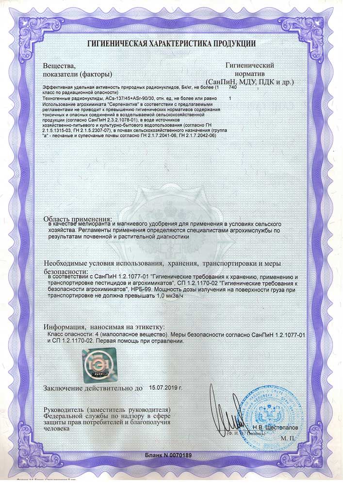 Агрохимикат «Серпенактив» предназначен в качестве мелиоранта в сельском хозяйстве для очистки почвы и воды от закисления и тяжелых металлов. «Серпенактив» получают при переработке горной породы – серпентинита, путем дробления, помола, механо- и термоактивации. «Серпенактив» фасуют и упаковывают в потребительскую и транспортную тару. Внешний вид: порошок от серого до коричневато-серого цвета, фракцией 200 мкм, без запаха.